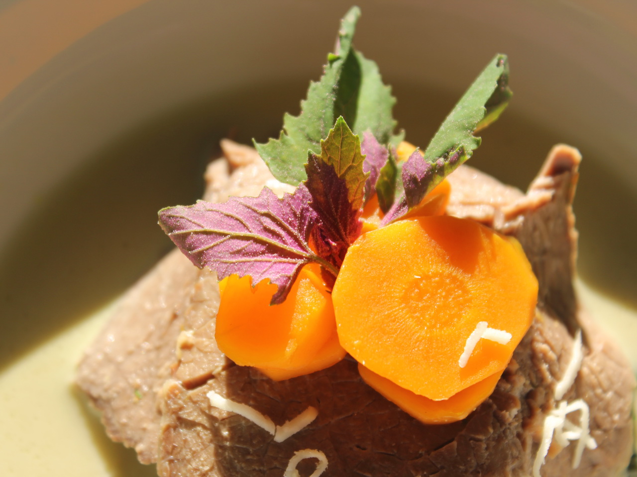 Wildkräuter aus den Steinschaler Gärten zur Deko: Magentamelde auf Rindfleisch Bild: J. Weiß - Steinschaler Naturhotels Bild darf nur mit klaren und unmißverständlichen Hinweis und Link auf den Urheber und dessen Organisation verwendet werden.